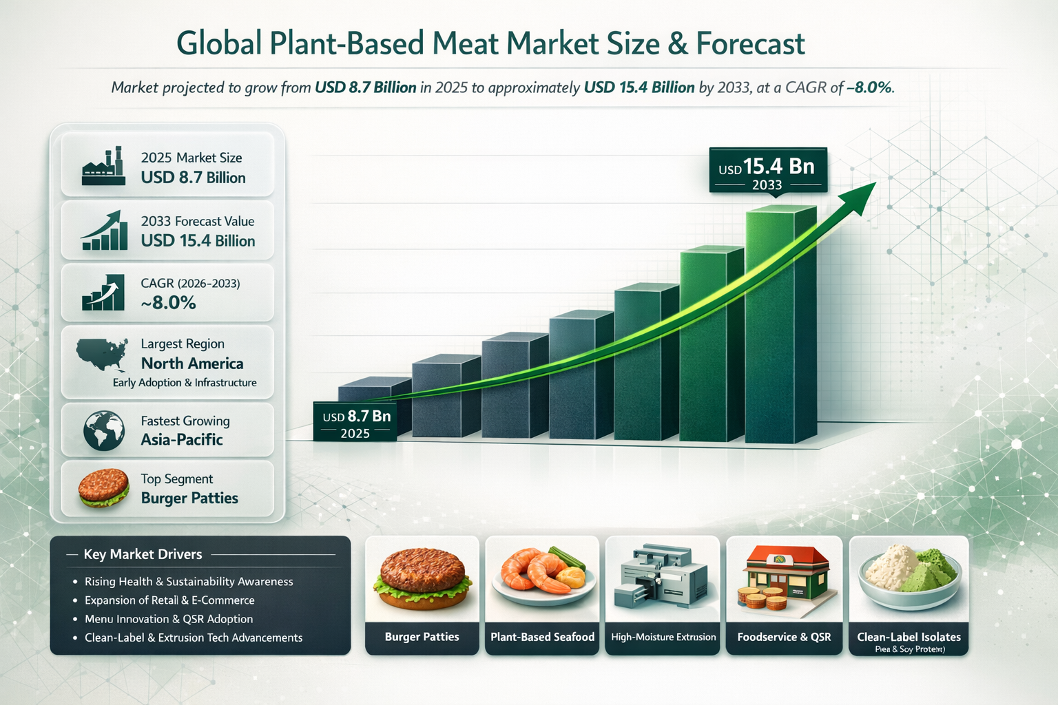 According to Phoenix Research, the Global Plant-Based Meat Market is valued at USD 8.7 billion in 2025 and is projected to reach USD 15.4 billion by 2033, registering a CAGR of ~8.0% during 2026–2033. Growth is being driven by evolving consumer preferences, rapid product innovation, and expansion of modern retail and foodservice channels.