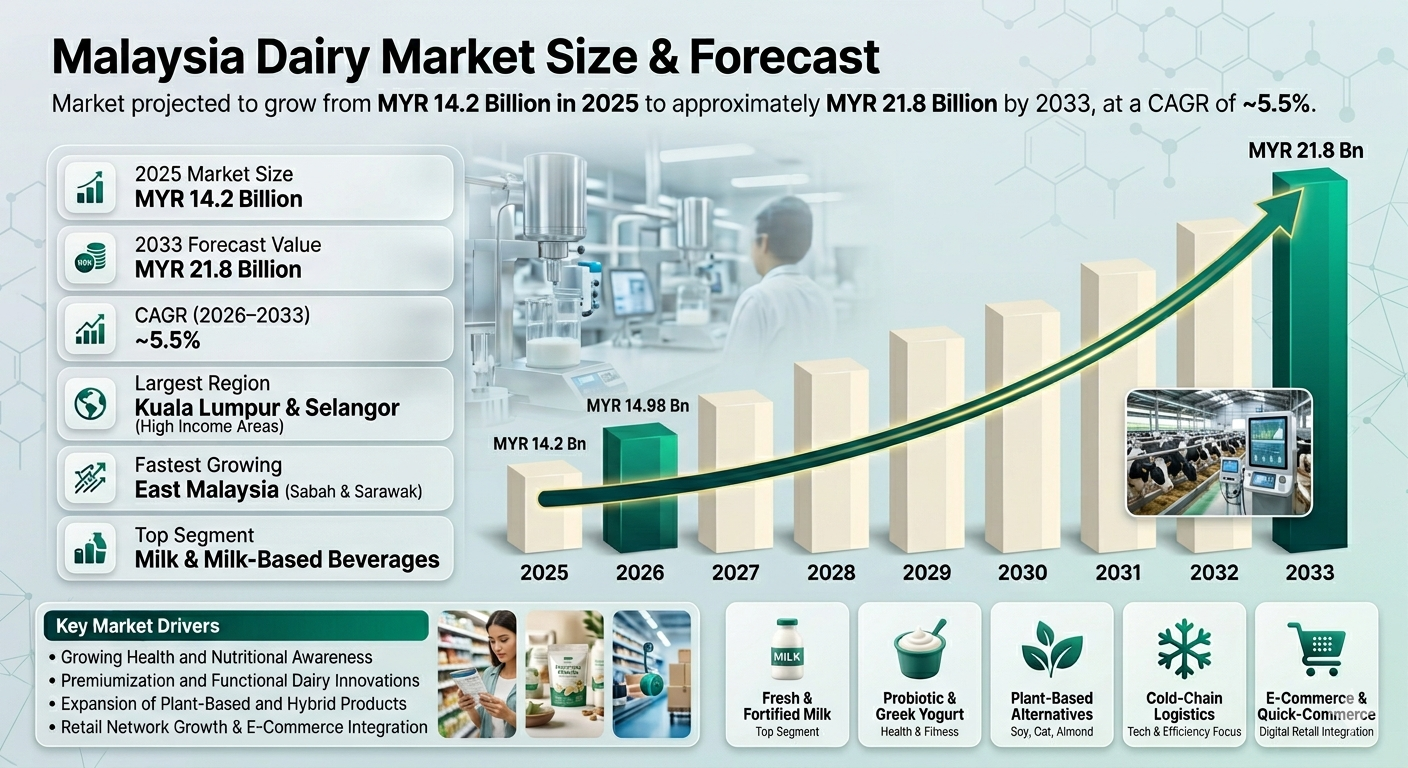 According to Pheonix Research, the Malaysia Dairy Market was valued at MYR 14.2 billion in 2025 and is projected to reach ~MYR 21.8 billion by 2033, growing at a CAGR of ~5.5% during 2026–2033.